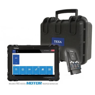 Multi-environment diagnostics platform with adaptable software coverage to support car repair specialists, based on compact size Axone Nemo Light tablet and Navigator Nano S2 vehicle communication interface. Easily adapt to more vehicle connections by automatic protocol selection of 16 Pin OBD Connector, Three CAN FD Channels, Ethernet DoIP, Blink Codes, K-L, CAN ISO 11898-3, FD CAN 11898-2, CAN SAE J2411, SAE J1850, Bluetooth, USB. Includes 1yr FREE Texpack & Motor TruSpeed access